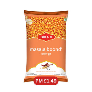 Fried crispy and spicy bengal gram flour balls. These tiny, round boondi spheres are seasoned with a zesty masala mix, making them a popular snack for eating plain or as an essential ingredient for Raita (yogurt dip) and various Indian chaat preparations.