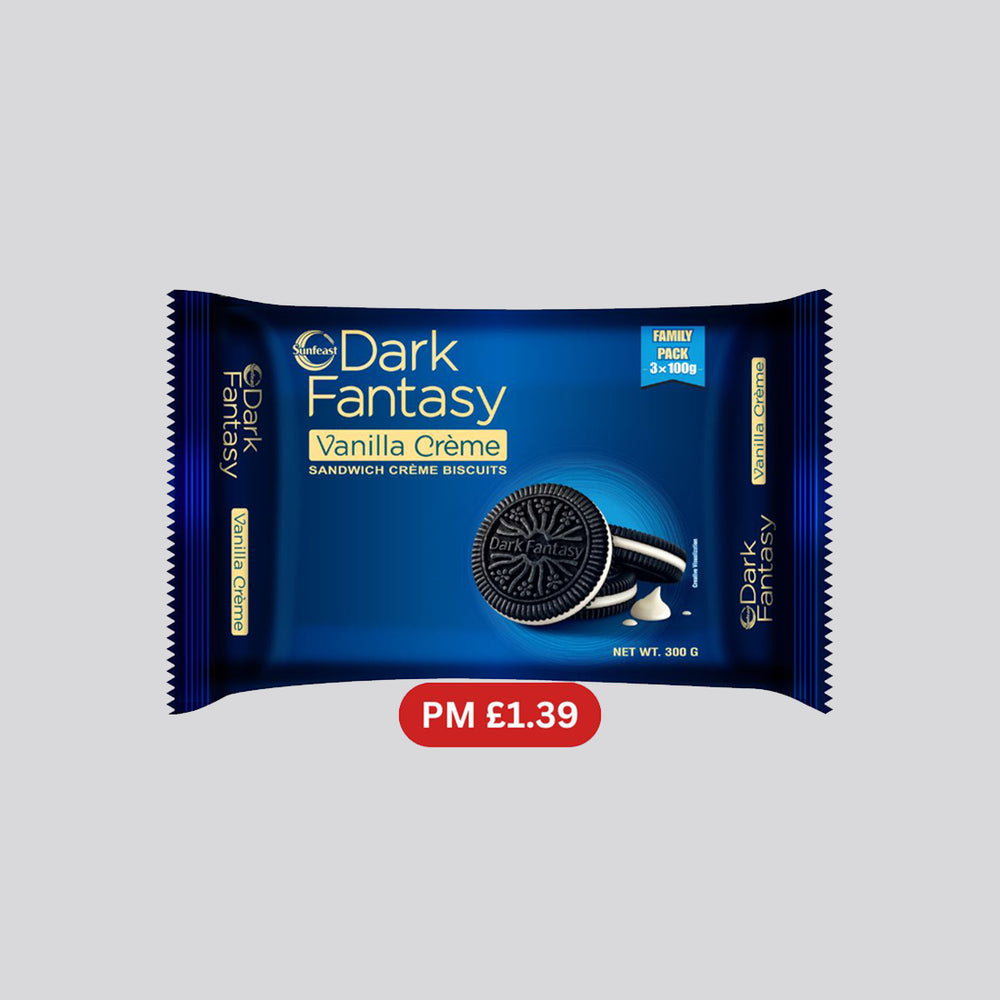 A creamy contrast to the chocolate biscuit. These sandwich crème biscuits feature a smooth, sweet vanilla crème filling between two dark, crunchy chocolate biscuits. The 300g Family Pack also includes 3 separate 100g packs.