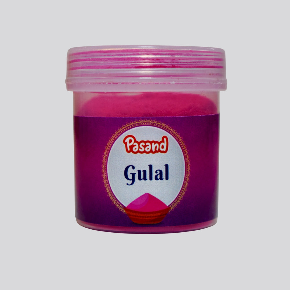 This small container holds Gulal, the traditional, brightly colored powder used during the Hindu festival of Holi, the Festival of Colors. Gulal is thrown playfully to celebrate the arrival of spring, friendship, and joy. The color of this particular product appears to be a vibrant Pink/Magenta. While used primarily for the Holi festival, it can also be used in other religious ceremonies or celebrations. The Pasand branding on the simple tub indicates it is a ready-to-use, festive item.