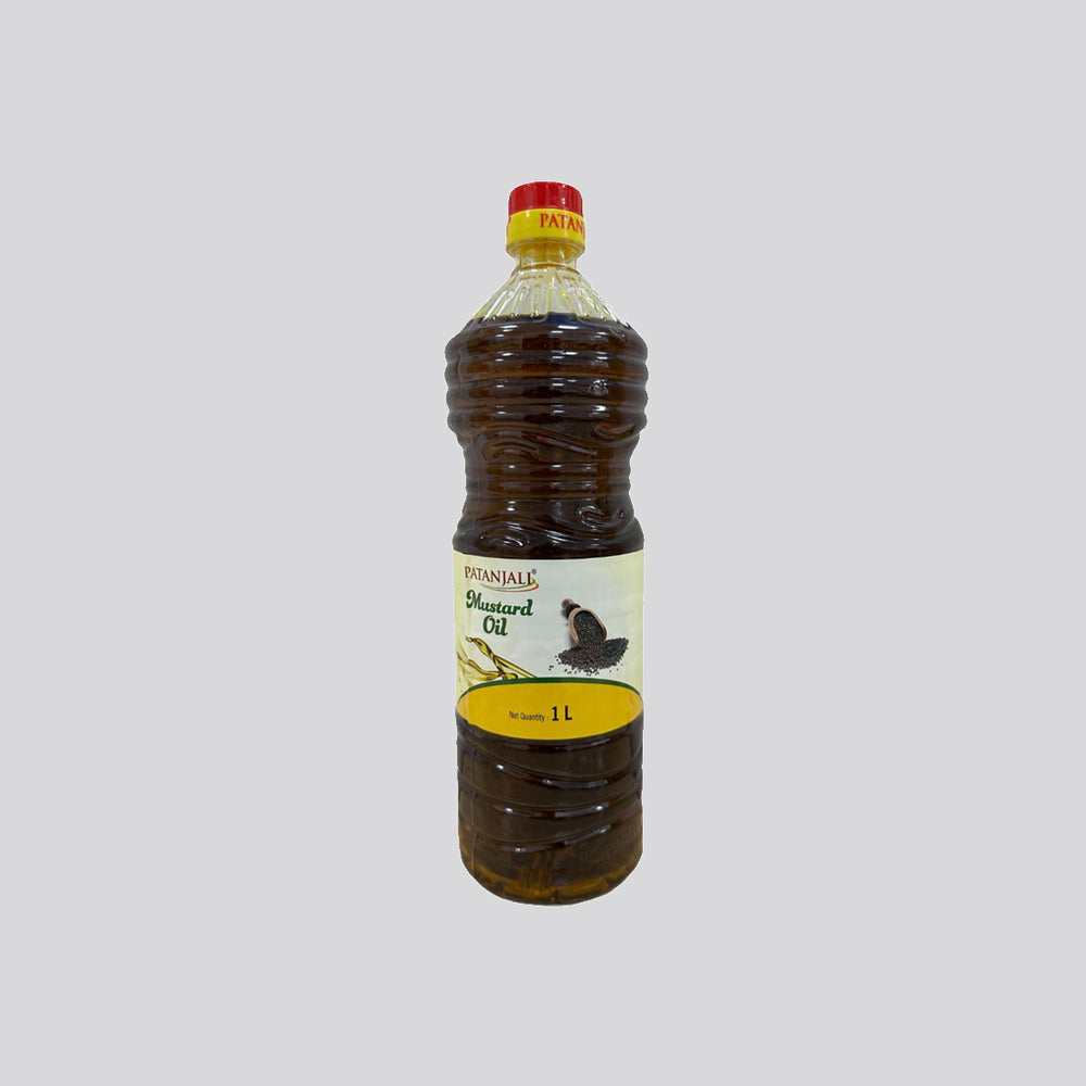 This is a 1-liter bottle of Patanjali Mustard Oil, a widely used cooking oil in Indian and South Asian cuisines, particularly in the northern and eastern regions. Mustard oil is known for its strong, pungent flavor and aroma, which adds a distinct taste to food. It is also traditionally valued for its health properties, and it is often used for massage as well. The product is bottled in a clear plastic container, making it a staple kitchen ingredient for frying, sautéing, and tempering spices (tadka). The bottle confirms a net quantity of 1 Liter.